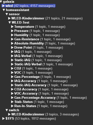 If you use HomeAssistance discovery, the device tree for HomeAssistance is created. This is published under the topic 'homeassistant/sensor/[MQTT Client ID]' via MQTT.