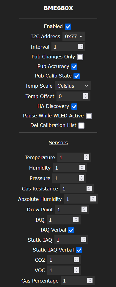 Applies to all sensors. The number of decimal places is set here. If the sensor is set to -1, it will no longer be published. In addition, the IAQ values can be activated here in verbal form.